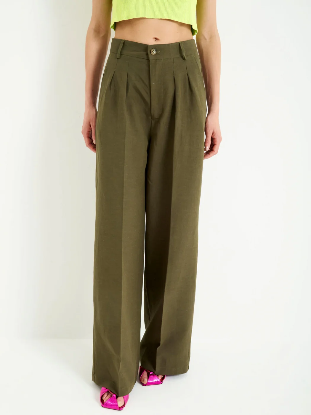 Dámske široké ľanové nohavice s vysokým pásom VICOLO khaki zelené