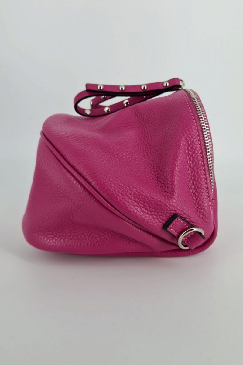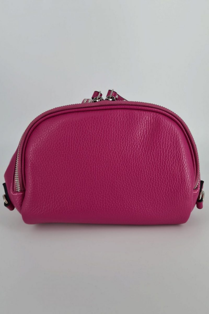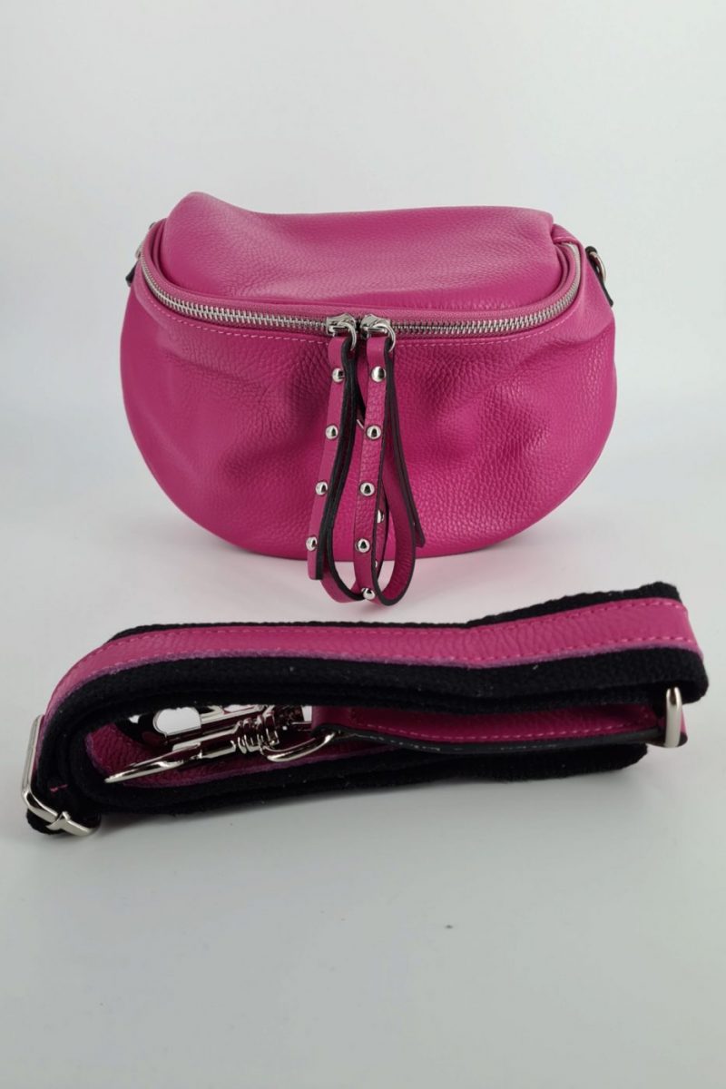 Dámska cyklámenová kožená ľadvinka, ktorá je absolútne najpredávanejšia v našom portfóliu. Je väčšia a zmestíte do nej všetko potrebné. Najčastejšie sa tento typ ľadviniek nosia crossbody, vyššie dámy ju môžu vďaka dlhšiemu ramienku nosiť priečne telom. Popruh na kabelke je nastaviteľný. Hlavné zapínanie je na zips a kovanie je v striebornej farbe.