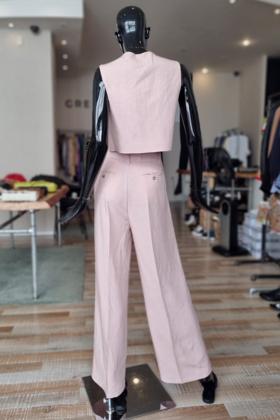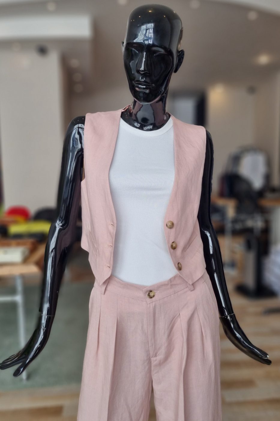 Ľanová vesta bez rukávov. Falošný detail predného vrecka. Zapína sa vpredu na gombíky. Odporúčame zladiť so širokými ľanovými nohavicami a ľanovým sakom z našej ponuky.