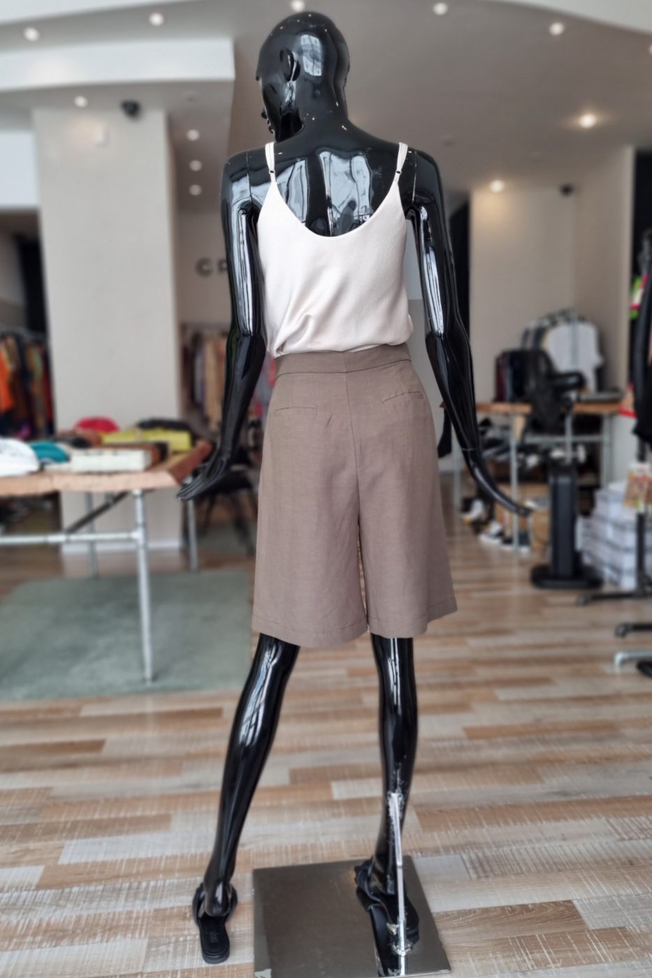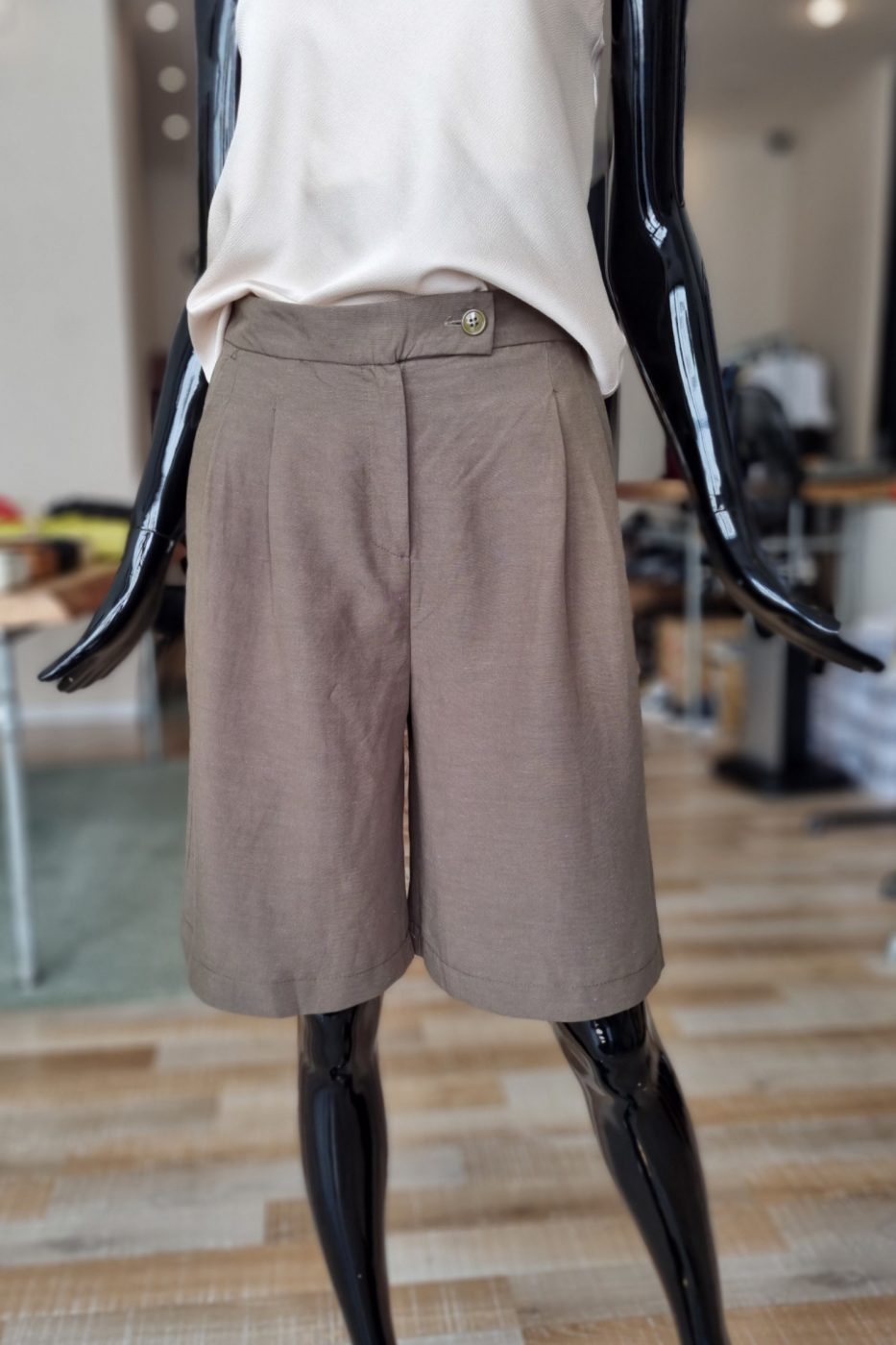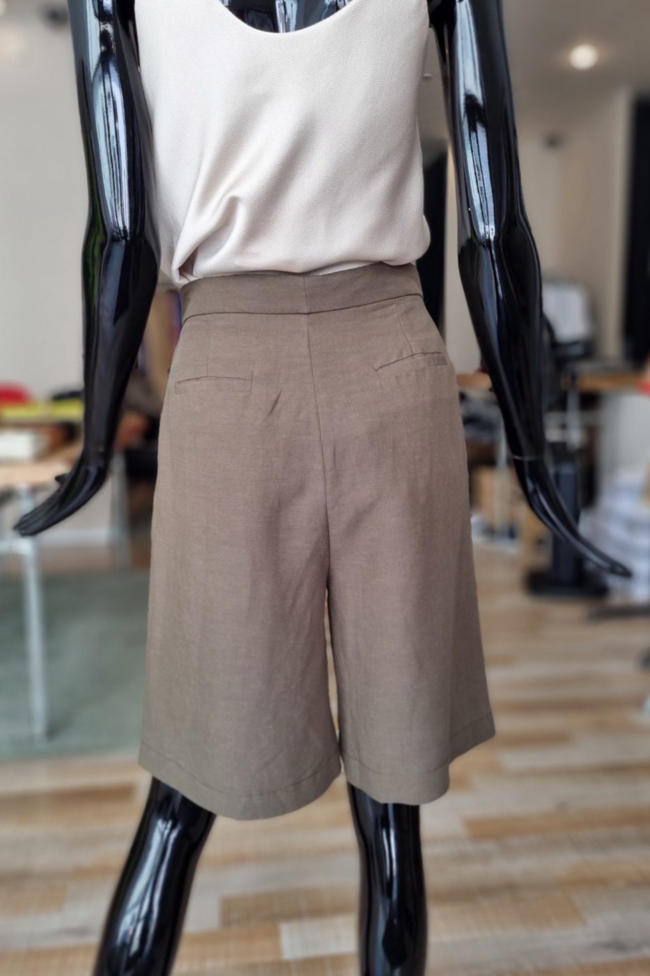Tieto dámske ľanové krátke nohavice khaki farby sú nadčasové a hodia sa na rôzne príležitosti. Majú vysoký pás, voľnejší strih a po bokoch majú dve vrecká.  Stačí už len doladiť sakom z našej ponuky a skvelý outfit je na svete!