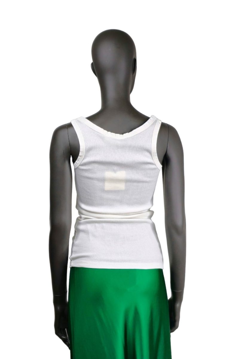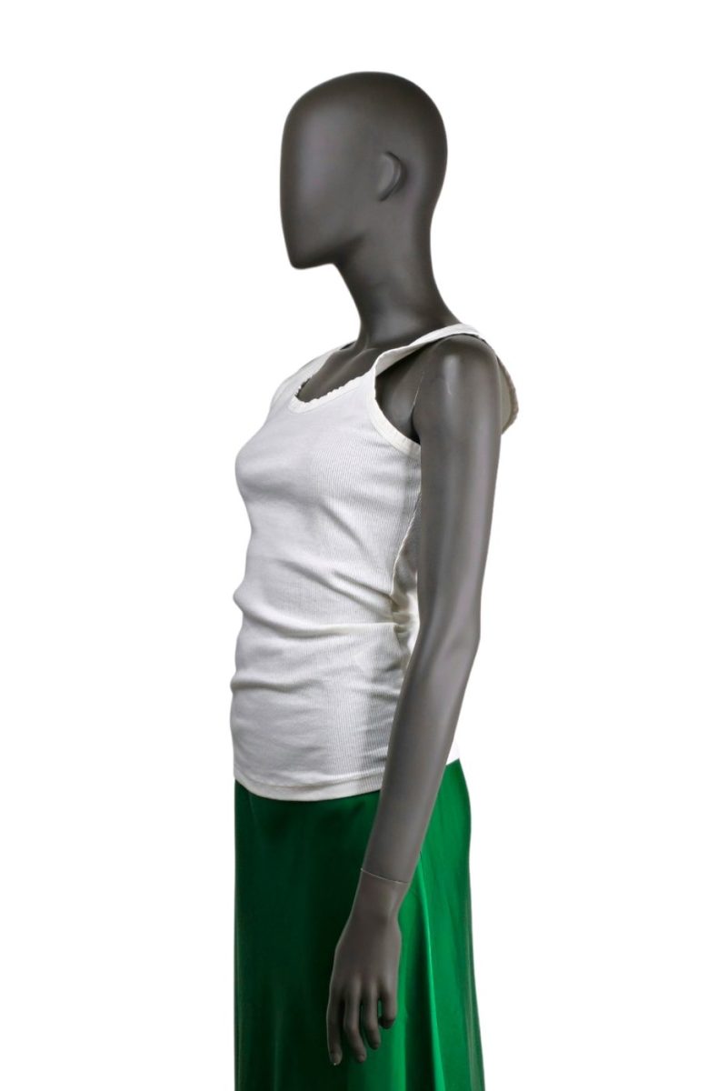 Jednofarebné biele tielko s jemným rebrovaním, má okrúhly lemovaný výstrih a tiež ramená.
