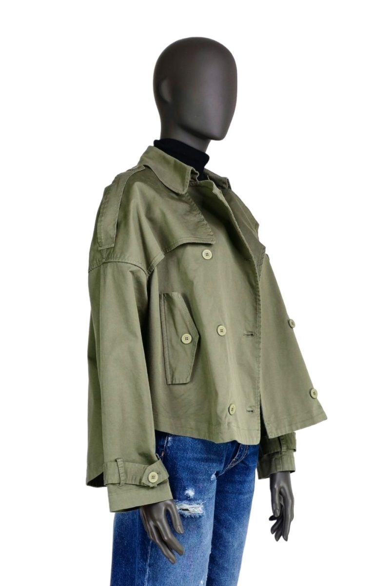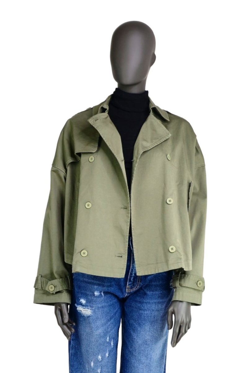 Krátky dvojradový trenčkot s dlhými rukávmi a chlopňovým golierom. Predné našité vrecká. Zapínanie na gombík. Trenčkot nemá podšívku.