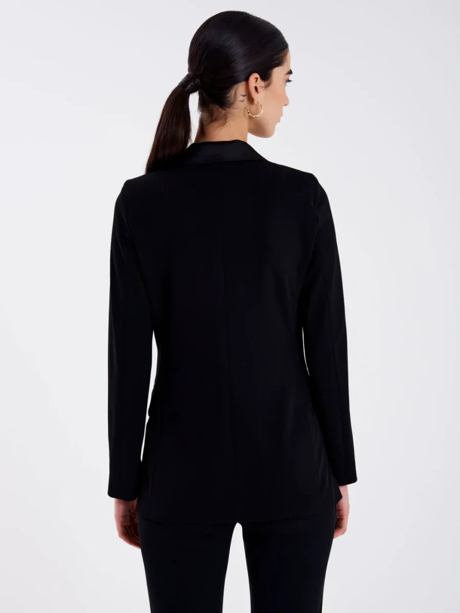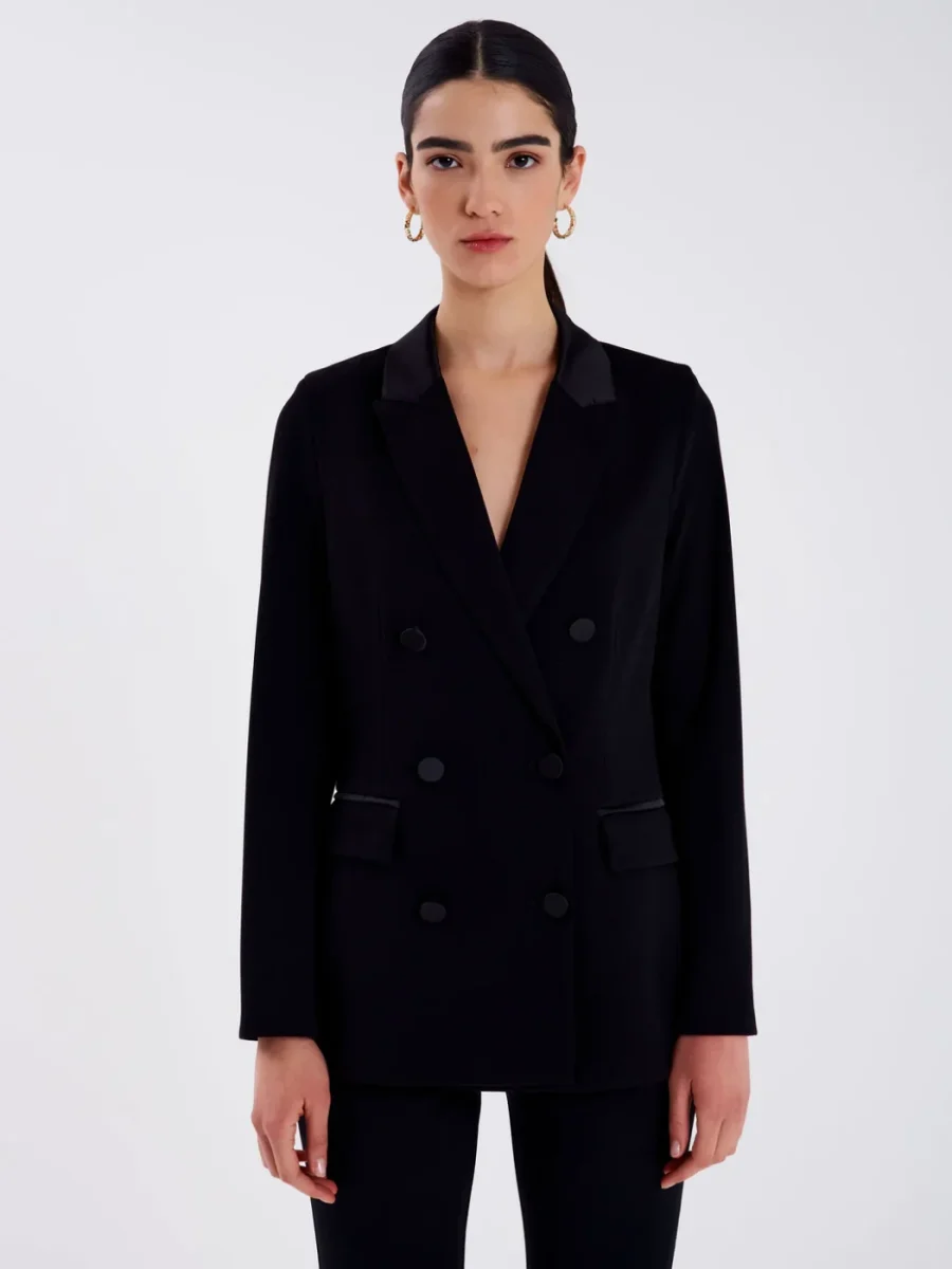 Sako so saténovým chlopňovým golierom. Dlhé rukávy a predné vrecká s chlopňou so saténovými detailmi. Predné dvojradové zapínanie na gombíky. Sako je strečové a nepodšité.