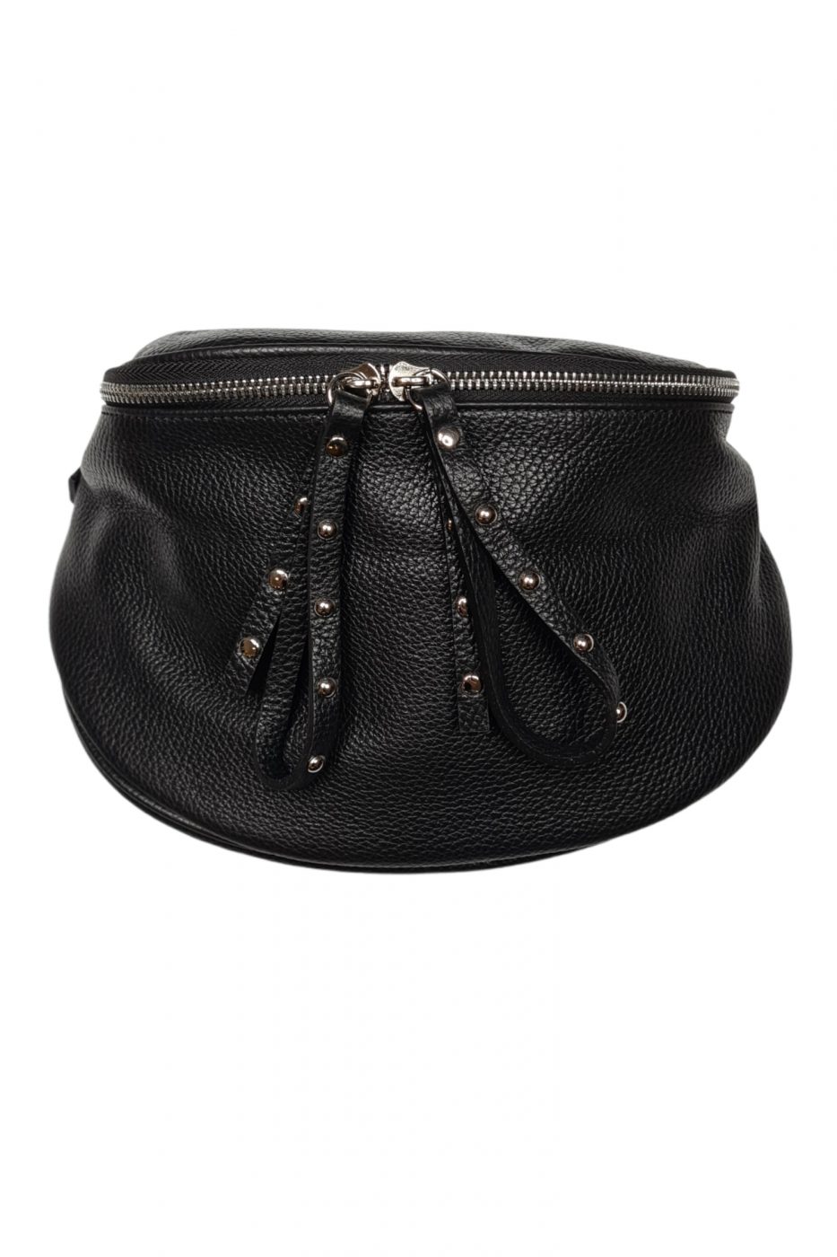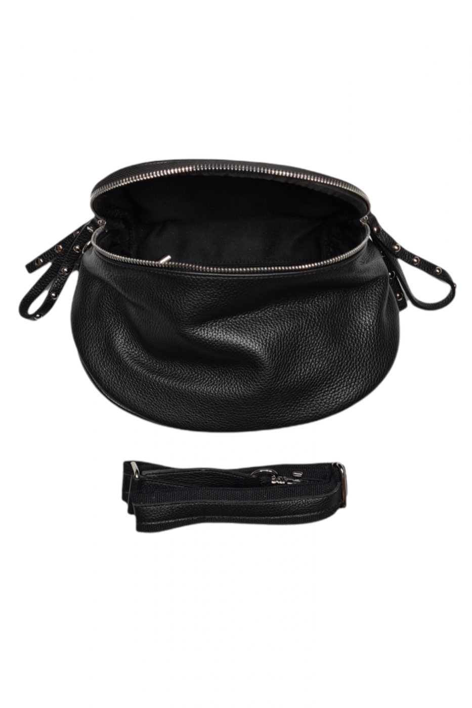 Čierna kožená crossbody kabelka, ktorá je absolútne najpredávanejšia v našom portfóliu. Je väčšia a zmestíte do nej všetko potrebné. Najčastejšie sa tento typ ľadviniek nosia crossbody, vyššie dámy ju môžu vďaka dlhšiemu ramienku nosiť priečne telom. Popruh je na kabelke je nastaviteľný. Hlavné zapínanie je na zips a kovanie je v striebornej farbe.