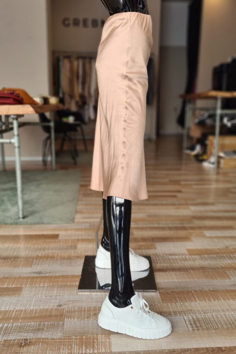 Táto midi sukňa saténového vzhľadu má rovný strih a pružný vysoký pás.