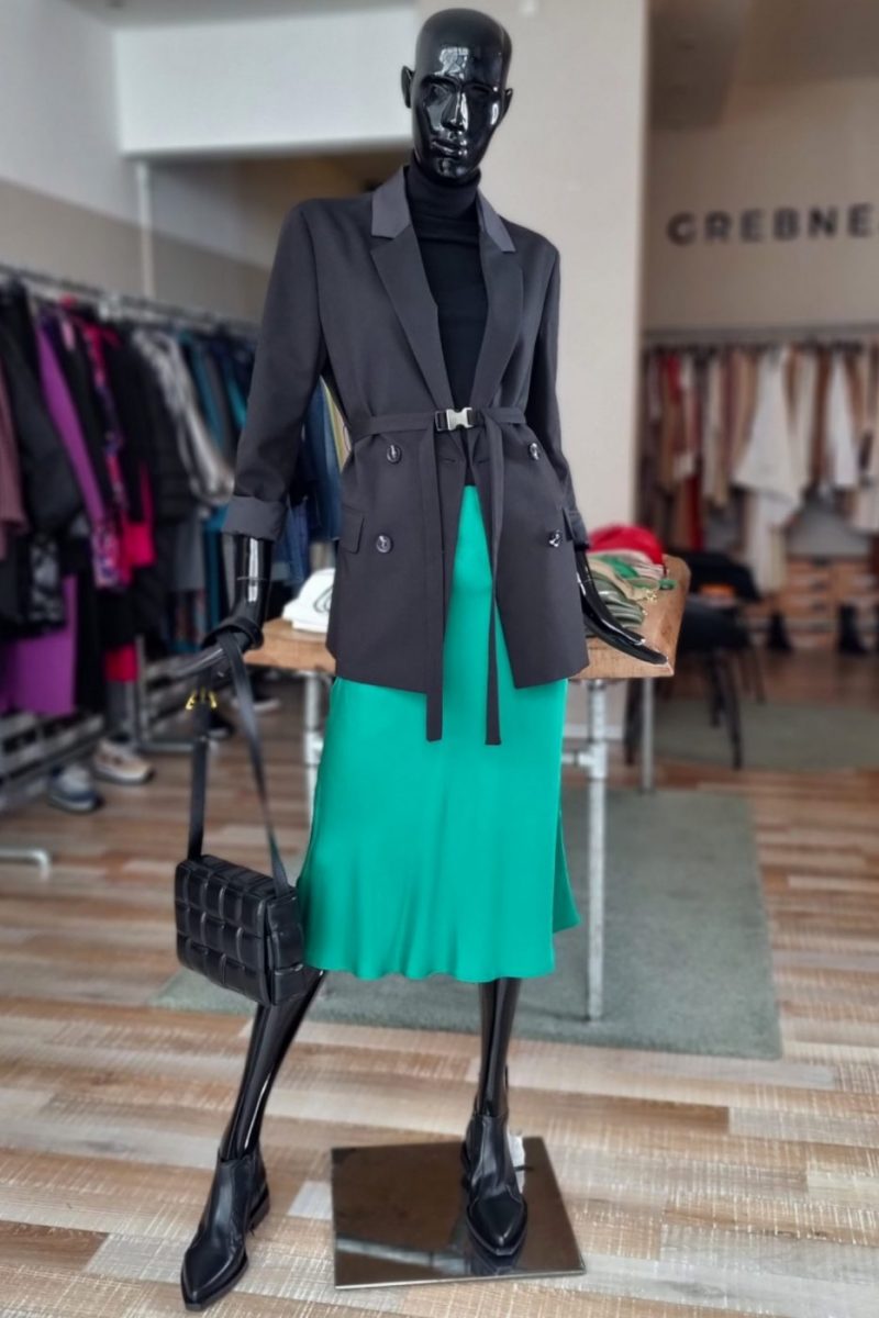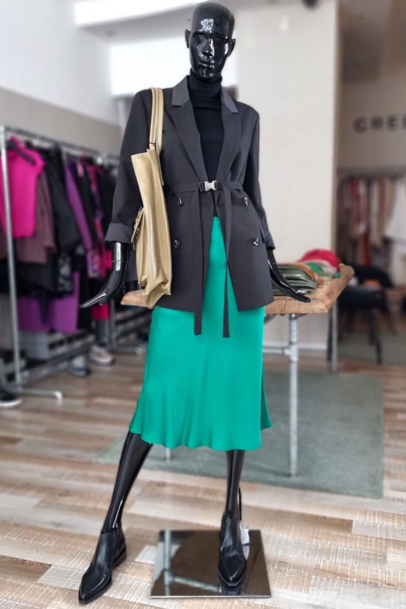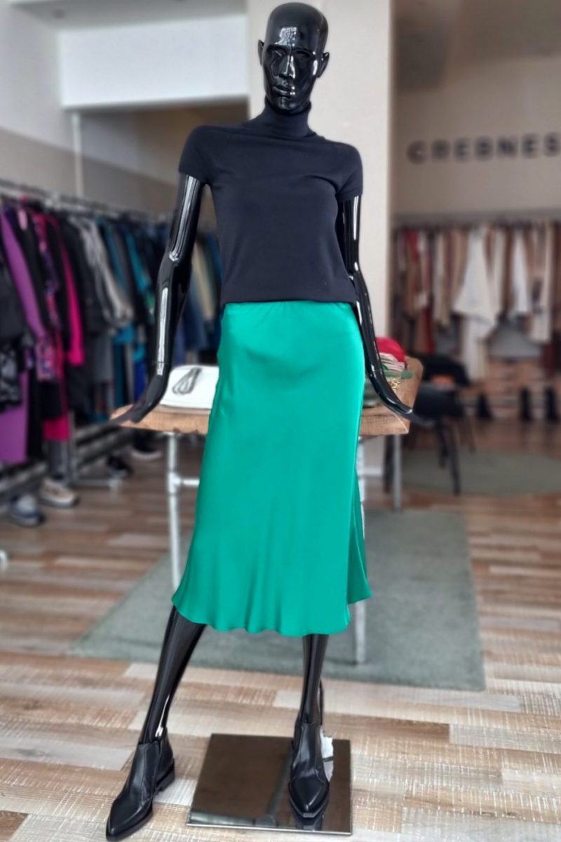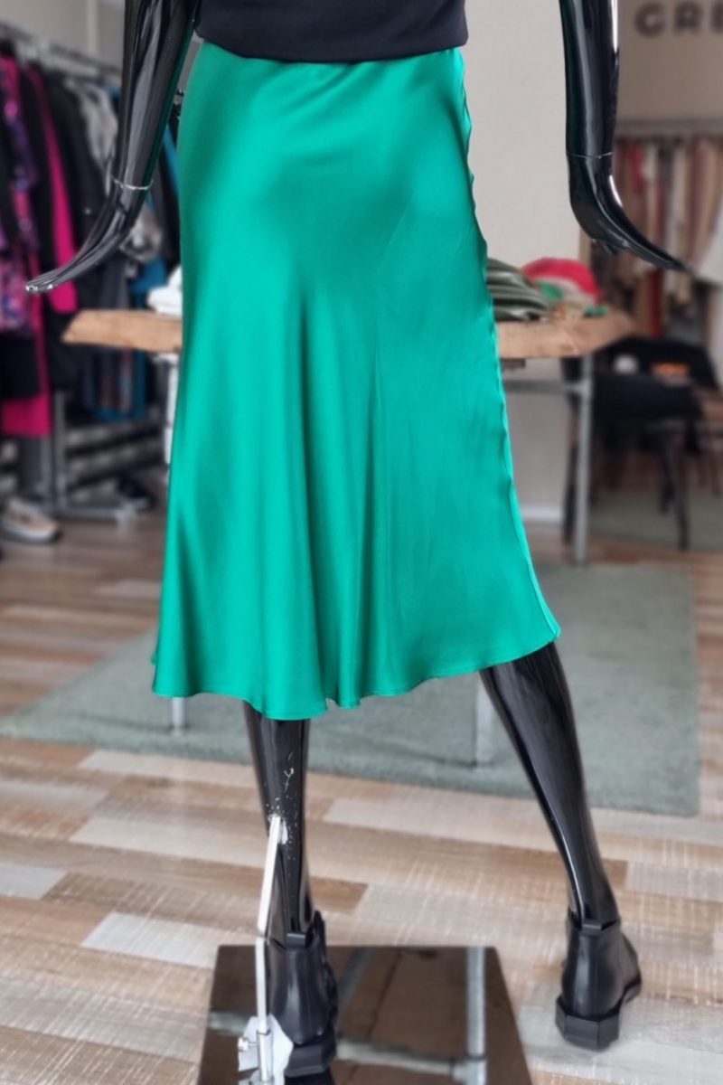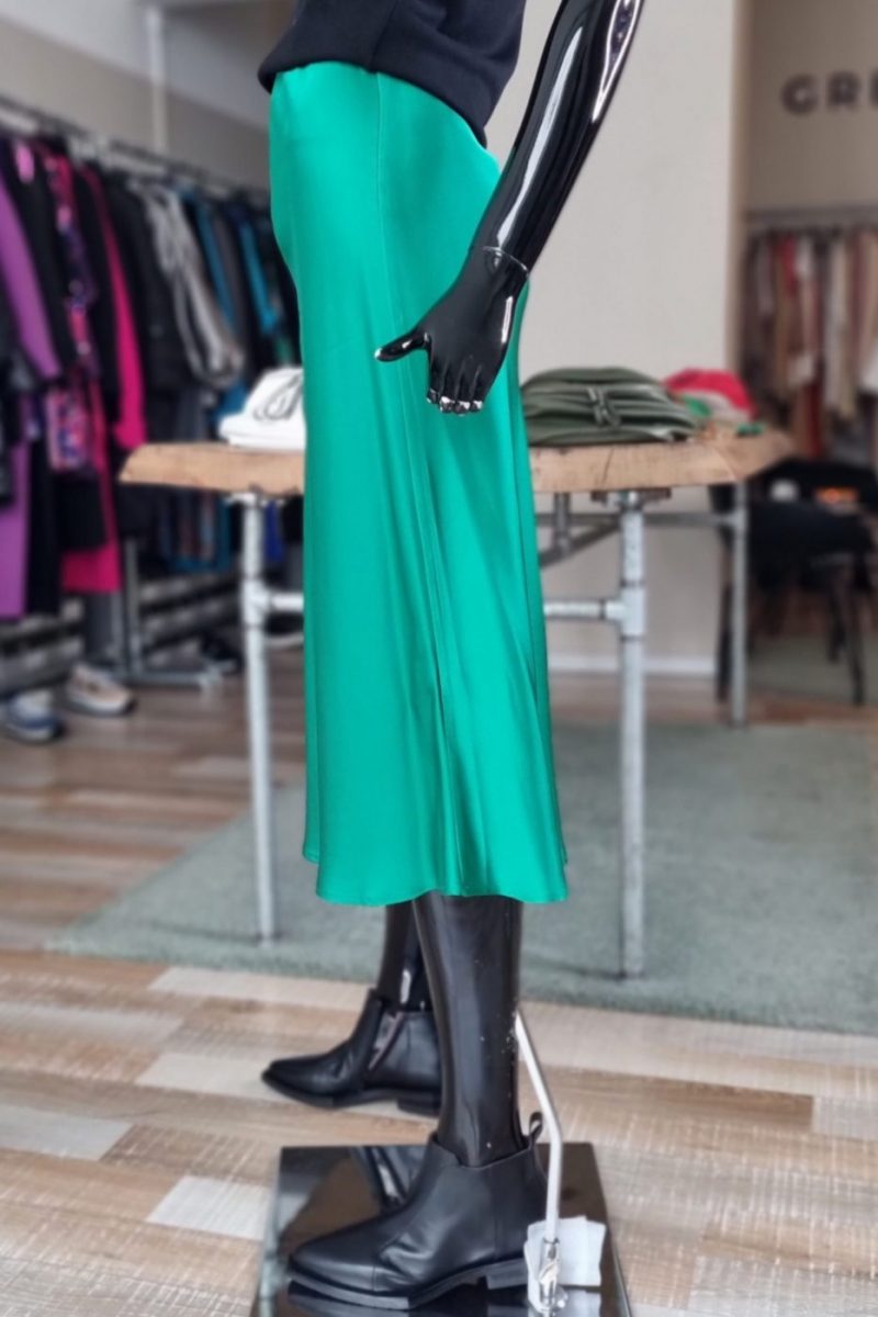Táto midi sukňa saténového vzhľadu má rovný strih a pružný vysoký pás.