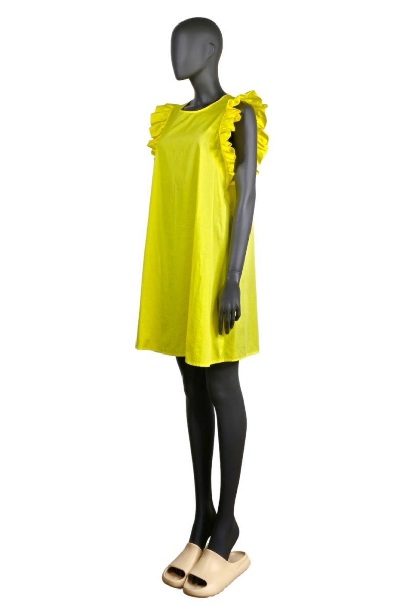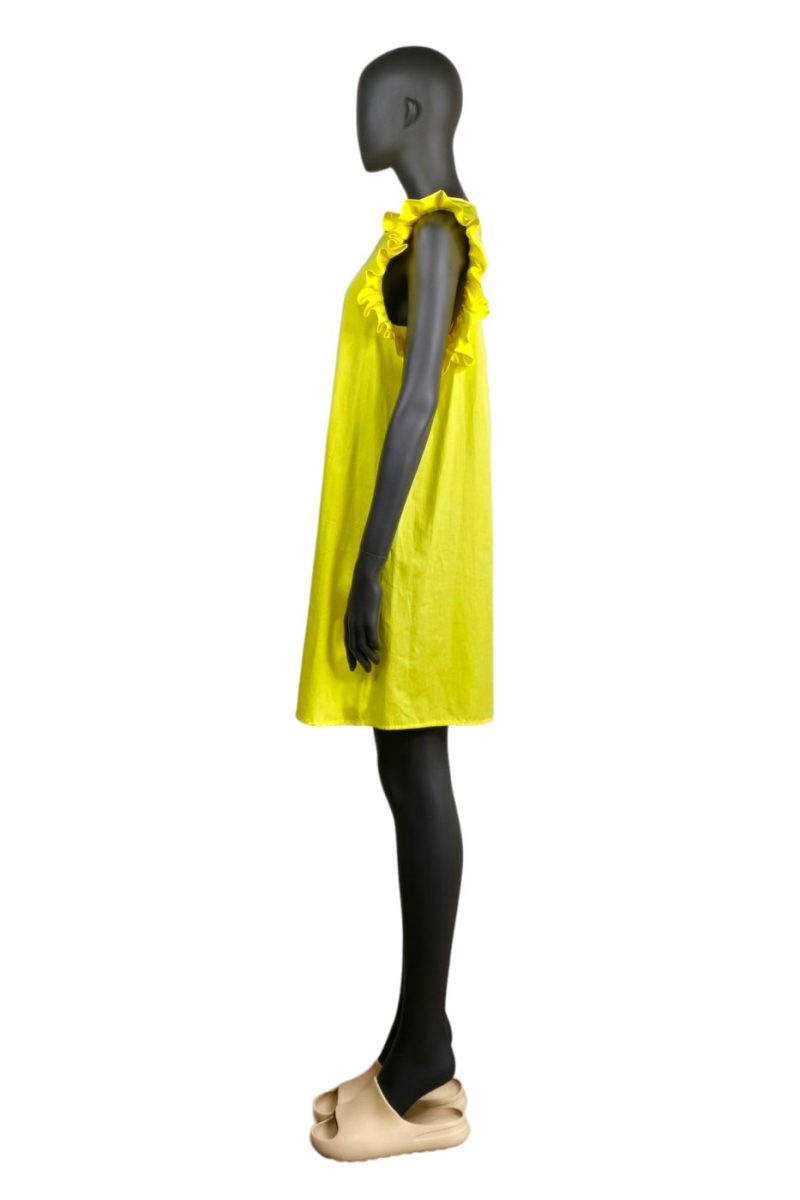 Šaty v ktorých určite vyniknete. Šaty žltej farby s volánmi na ramenách, zapínanie na gombíky v zadnej časti. Ideálne do školy, do práce, či na kávičku s kamoškami do mesta. Odporúčame zladiť s našimi koženými topánkami a koženými kabelkami.