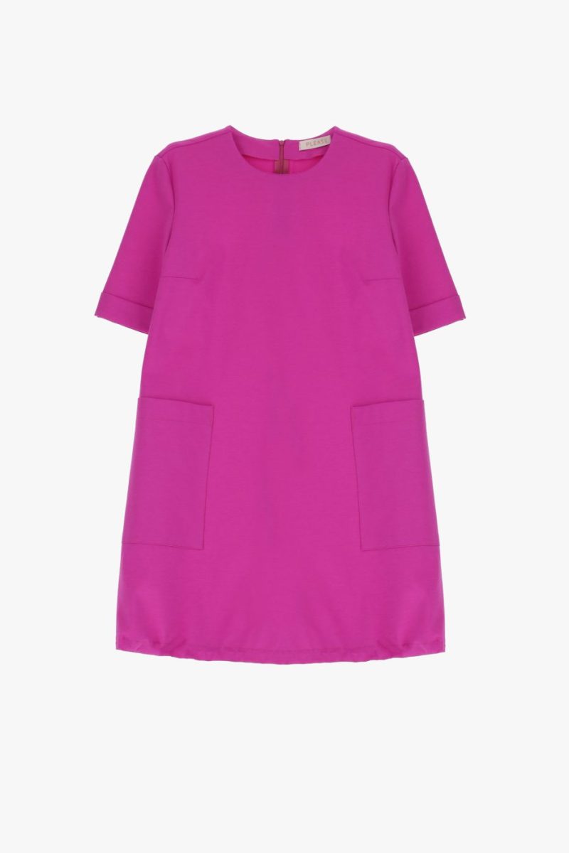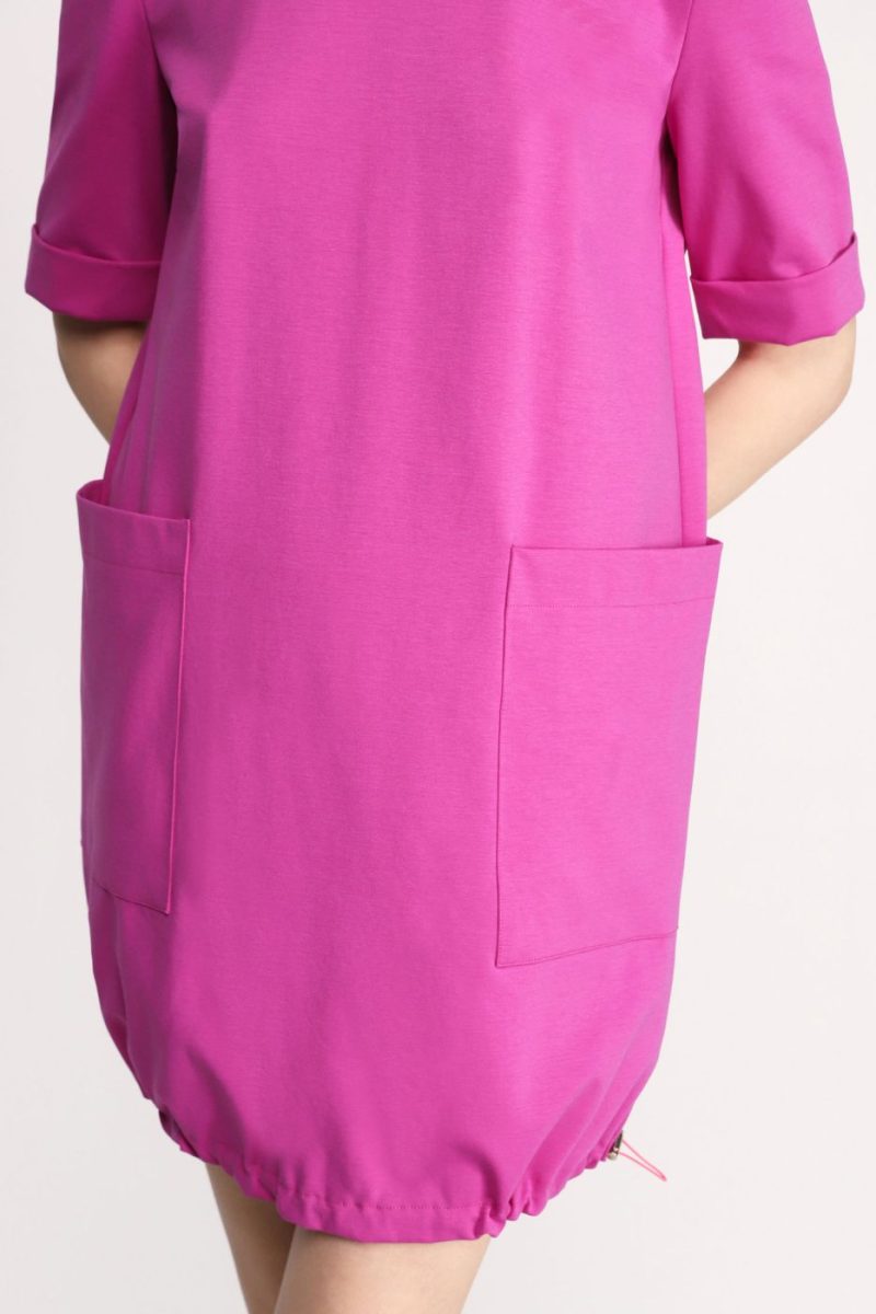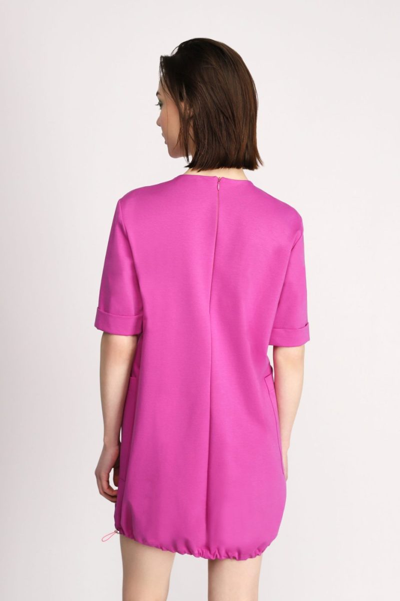Tieto jednofarebné mini šaty majú zapínanie na zips na chrbte, krátke rukávy a vpredu veľké vrecká. Spodný lem má sťahovací tunel.