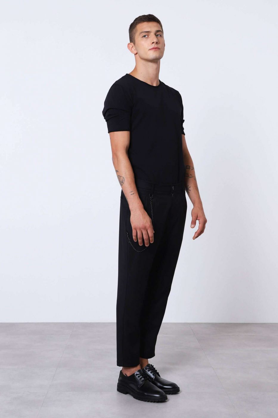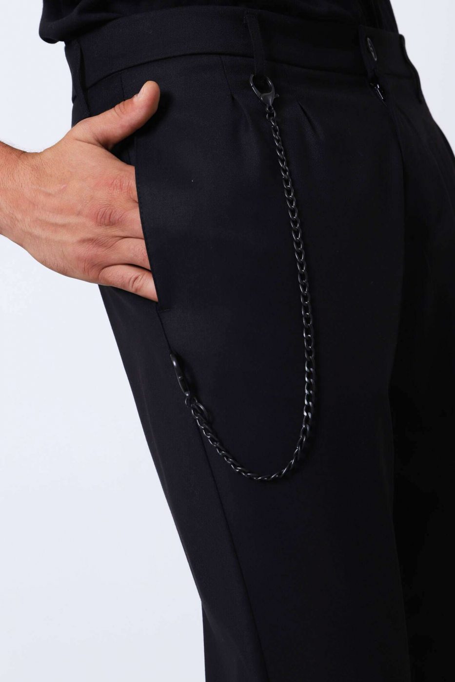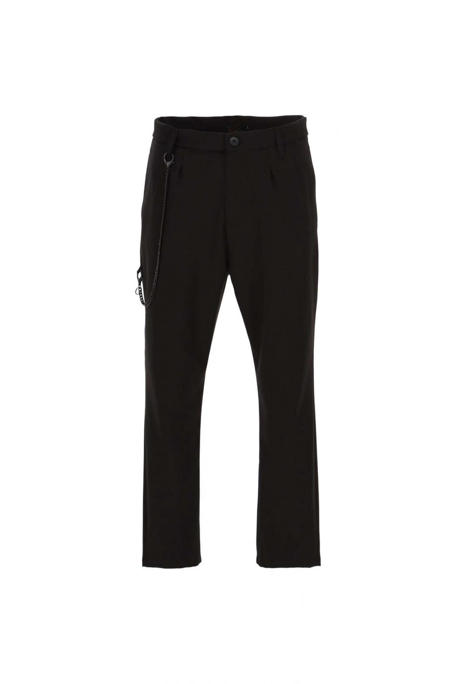 These mid-rise trousers feature symmetrical darts, welt side pockets and a detachable chain detail