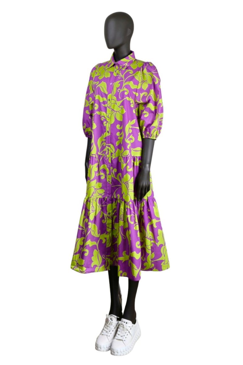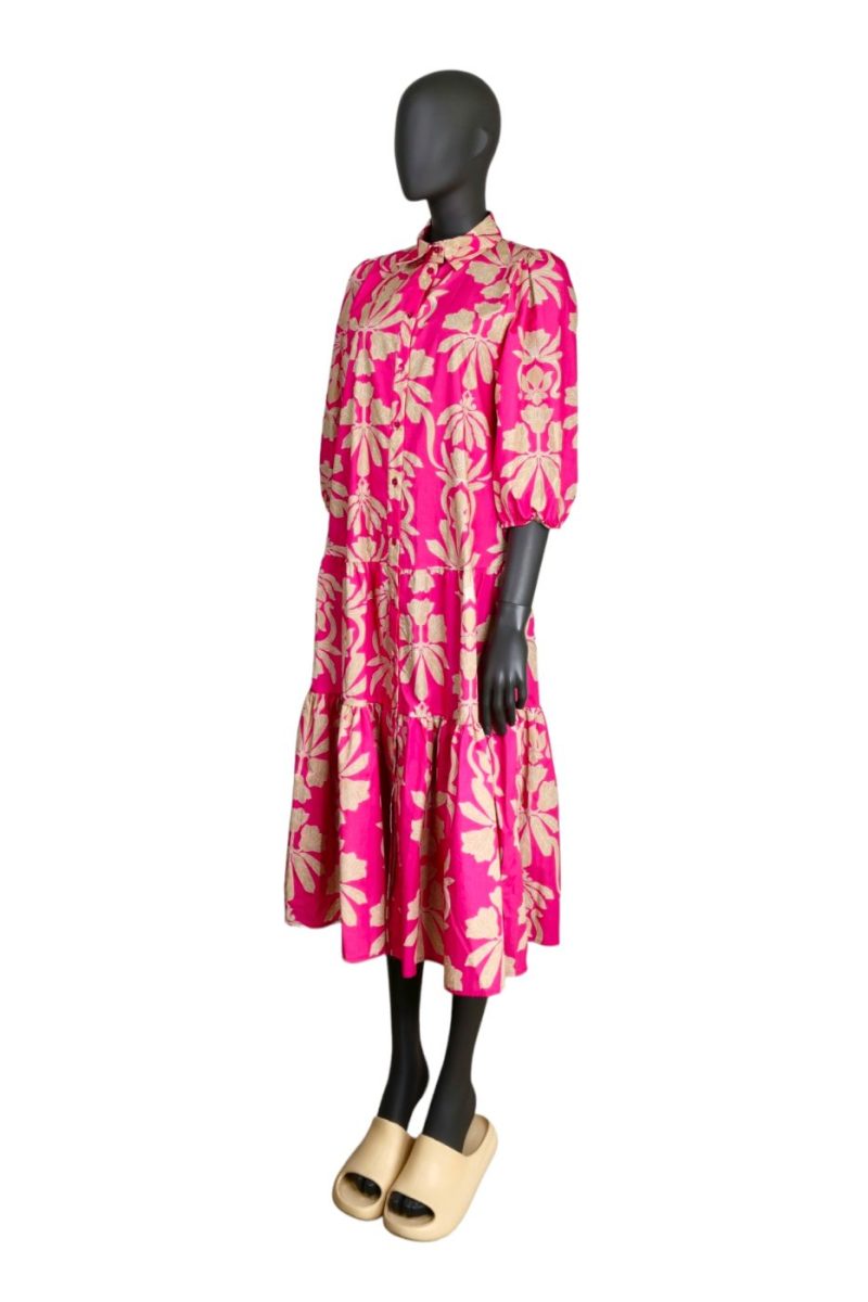 Košeľové maxi šaty VICOLO so zapínaním na gombíky cyklámenové so vzorom